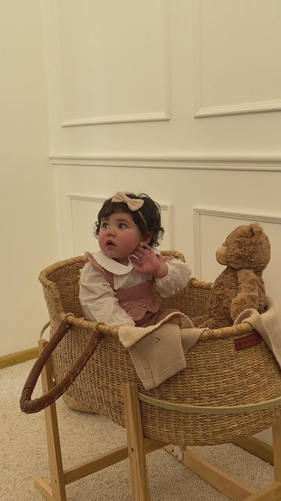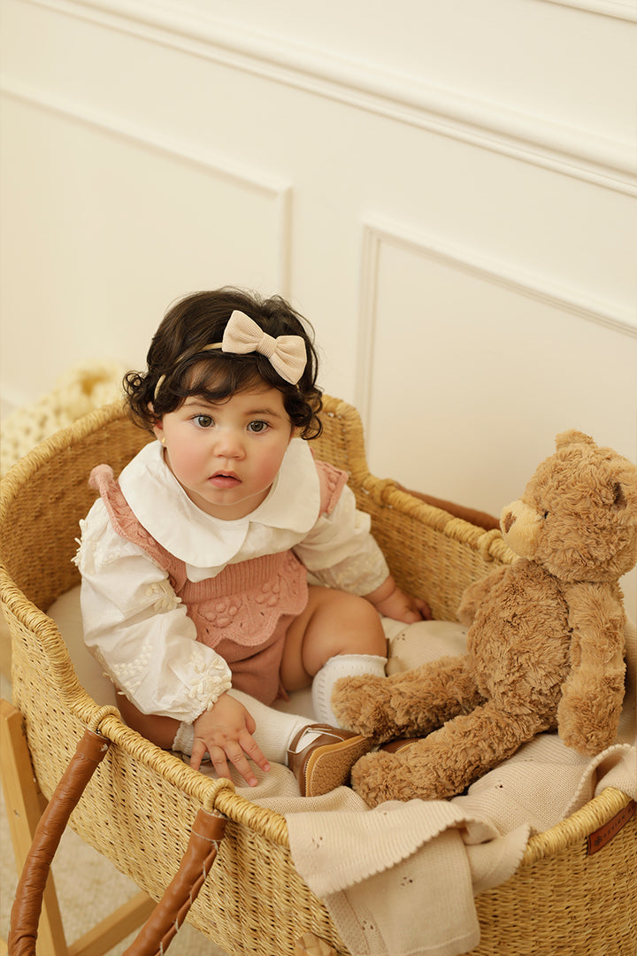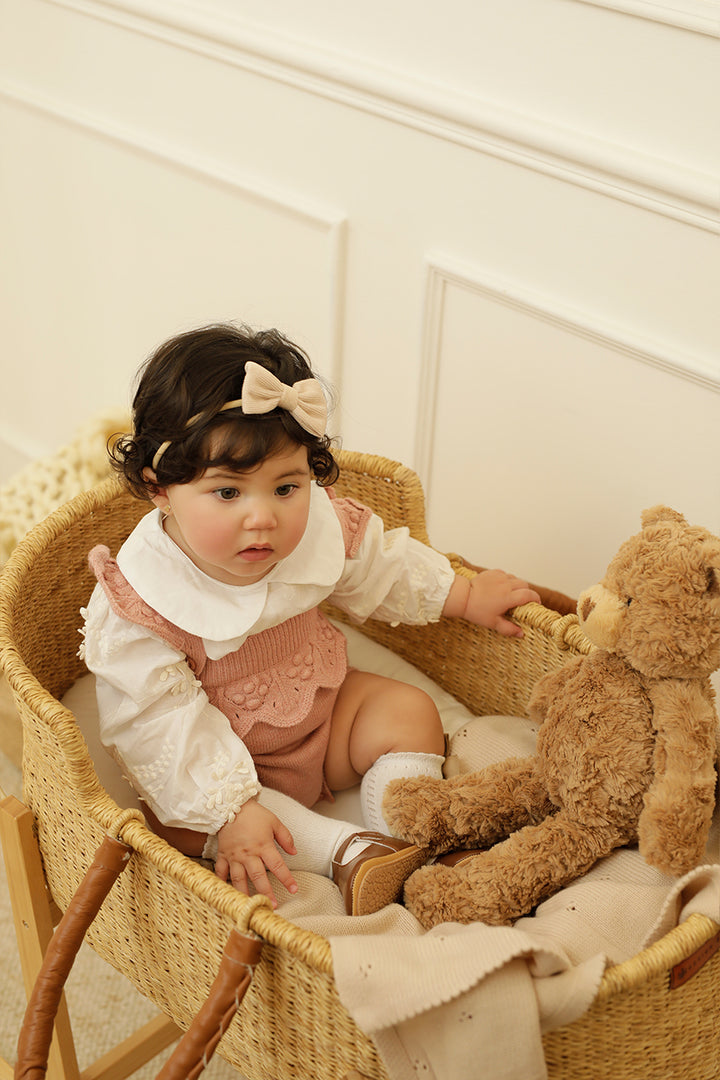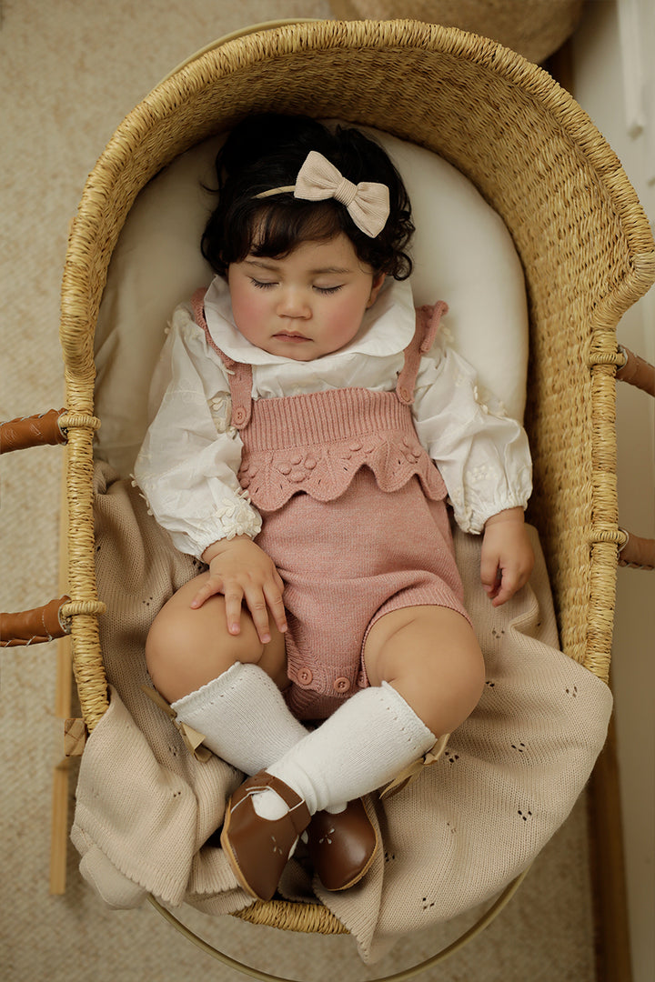 Braga tejida en un delicado tono rosa empolvado, confeccionada en algodón 100% de textura cálida y suave, perfecta para climas frescos. Su diseño resalta por los tirantes adornados con volantes y delicados bordados que aportan un aire romántico y clásico.