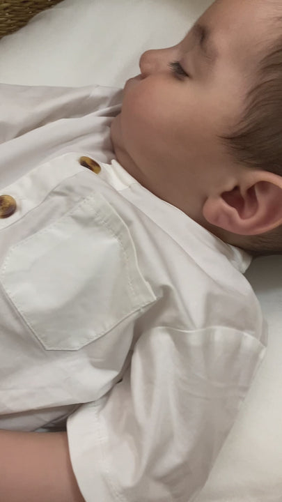 Camisa ligera y cómoda, elaborada en 100% algodón, ideal para mantener a tu bebé fresco y con libertad de movimiento. Su diseño incluye manga corta, cuello mandarín y botones decorativos tipo madera, que aportan un estilo limpio y encantador.