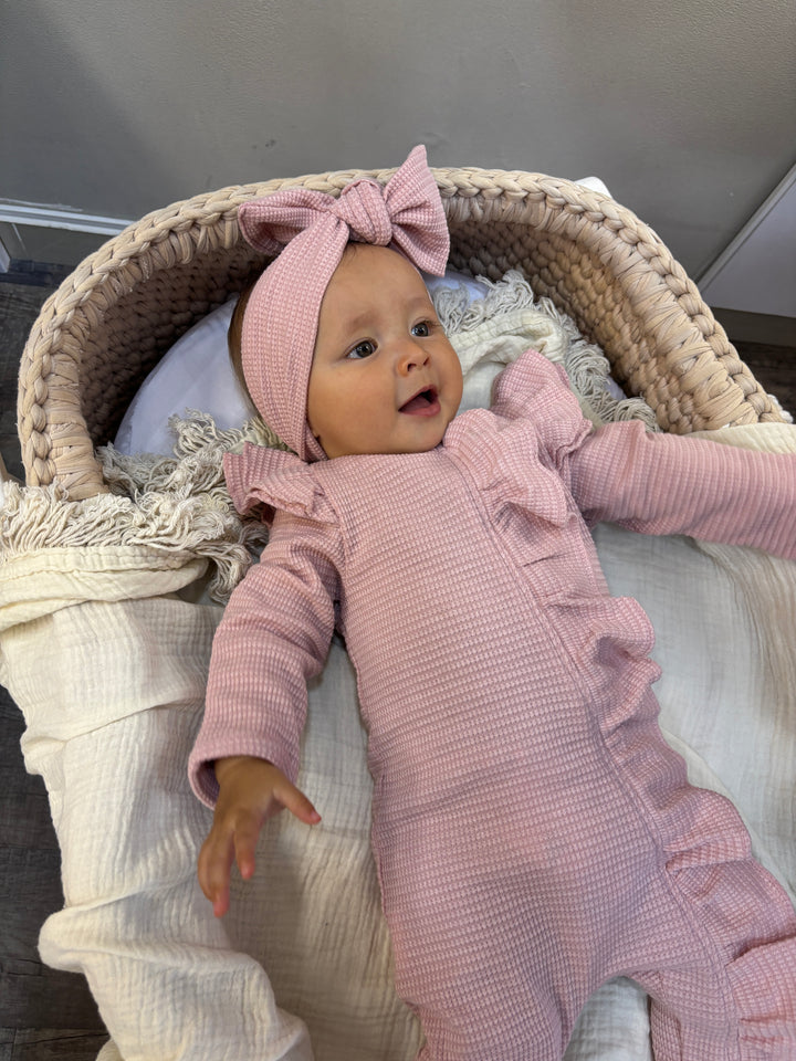 Enterizo para bebé en color rosa suave, con un diseño de volantes en los hombros y botones frontales que facilitan el cambio de pañal. Este enterizo de manga larga está confeccionado en un tejido suave y elástico, lo que garantiza la comodidad del bebé durante todo el día. Es ideal tanto para el día a día como para ocasiones especiales, ofreciendo un estilo adorable y práctico.