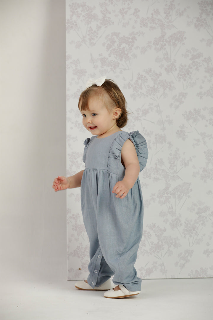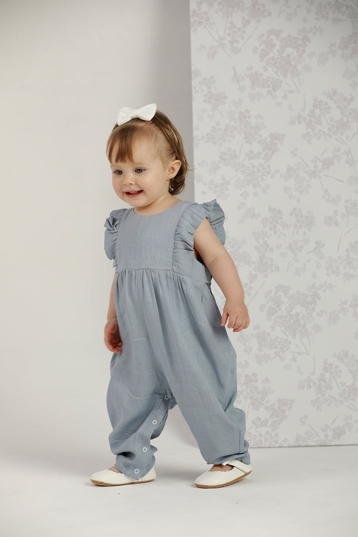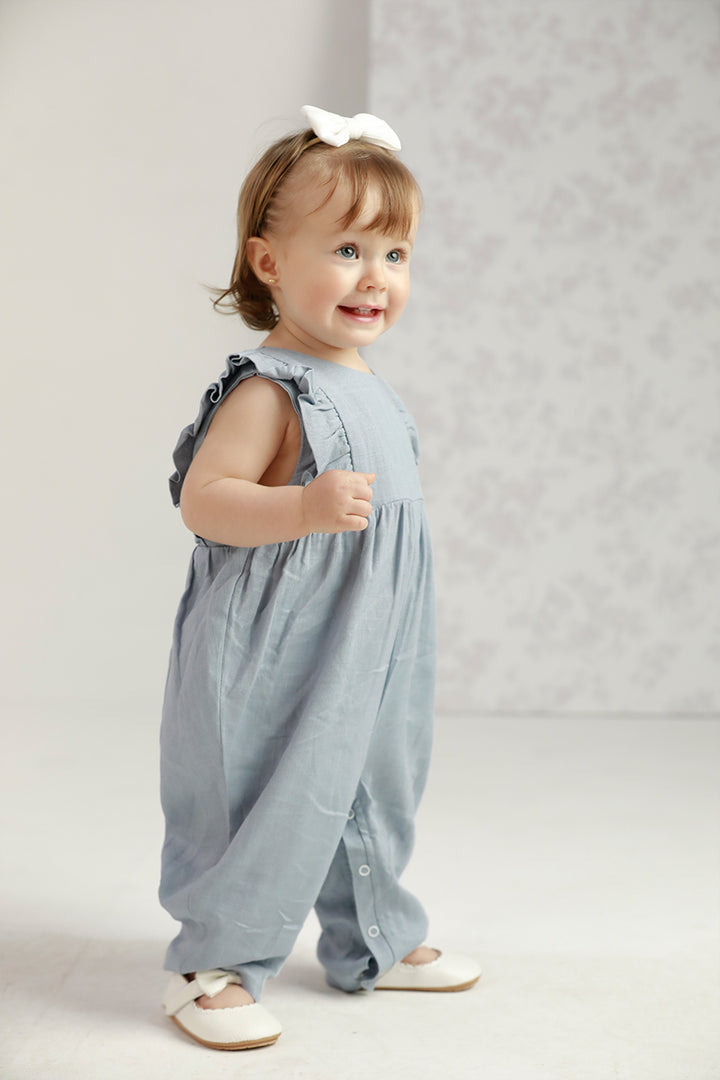 Este enterizo en tono azul suave es una prenda delicada y funcional, perfecta para acompañar a tu bebé en días especiales con frescura y estilo. Está confeccionado en una mezcla de lino y algodón, lo que lo convierte en una opción transpirable, liviana y cómoda para climas cálidos o templados.