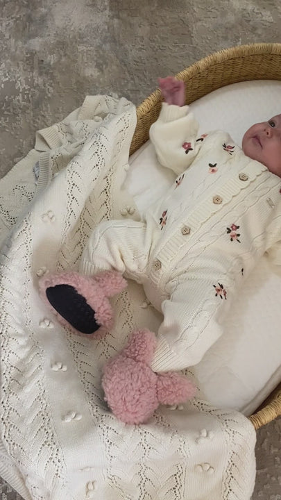 El diseño incorpora trenzas verticales tipo cable, que estilizan la prenda y le dan un look clásico. Cuenta con botones frontales en tono natural, que facilitan vestir y cambiar al bebé con comodidad.