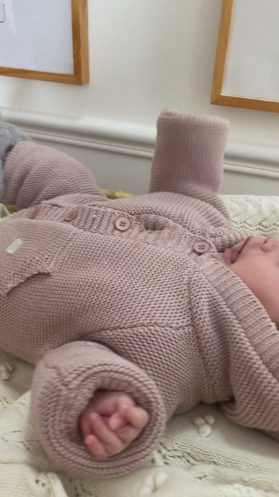 Este enterizo tejido para bebé está diseñado para brindar máximo abrigo, comodidad y ternura, ideal para climas fríos o templados. Cuenta con una capucha forrada internamente en material suave tipo peluche, que ayuda a conservar el calor y protege la cabecita del bebé.