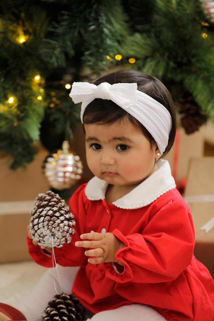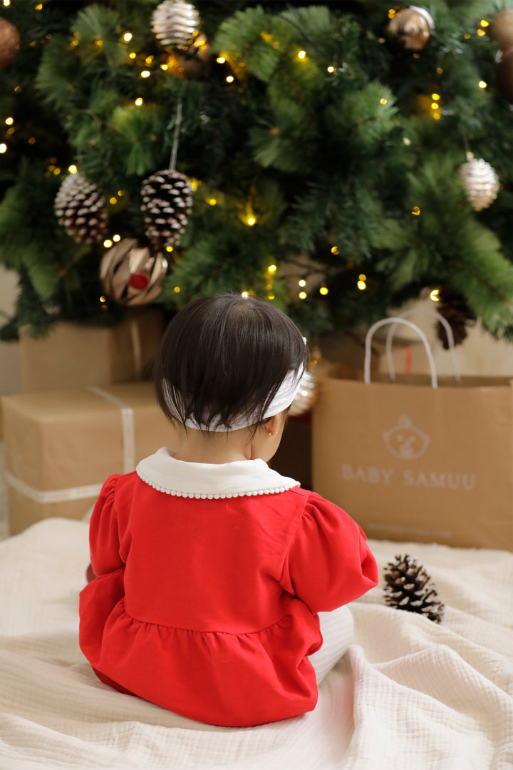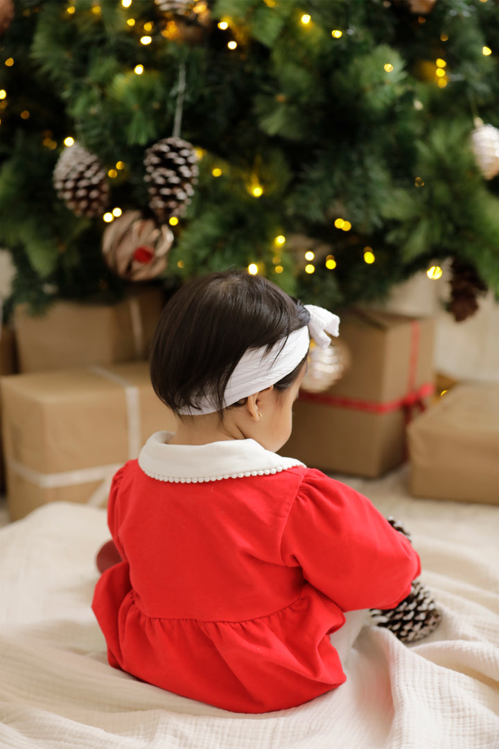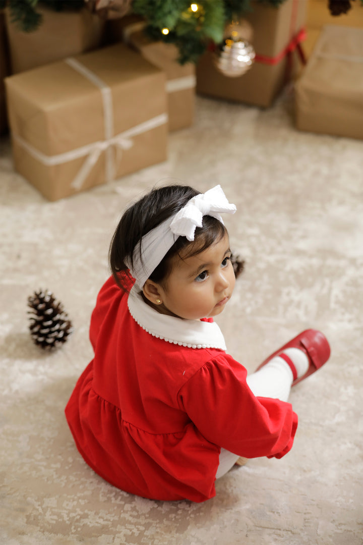 El diseño en color rojo vibrante destaca por su cuello blanco tipo babero con detalle de puntilla, que aporta un aire clásico y elegante, perfecto para ocasiones especiales o celebraciones. Los puños fruncidos con lazo y los botones frontales decorativos complementan el look con delicadeza y encanto.