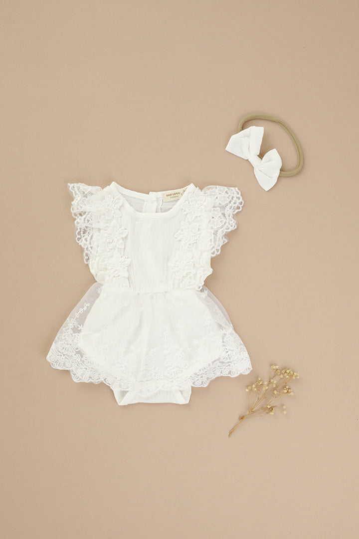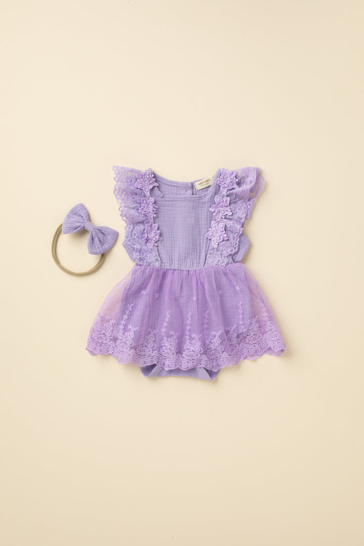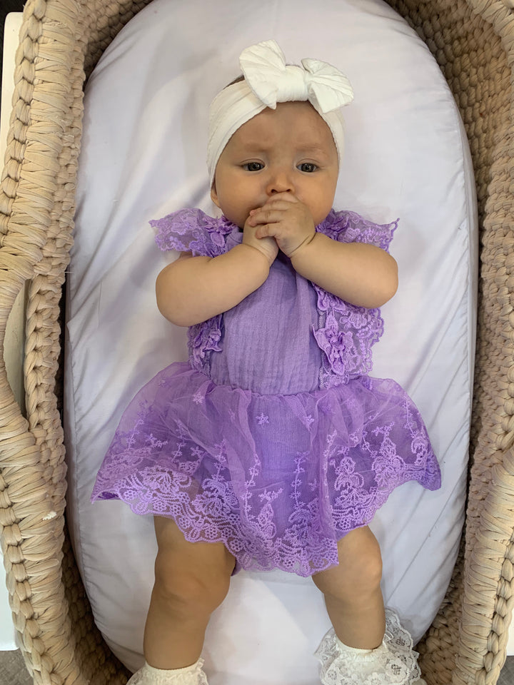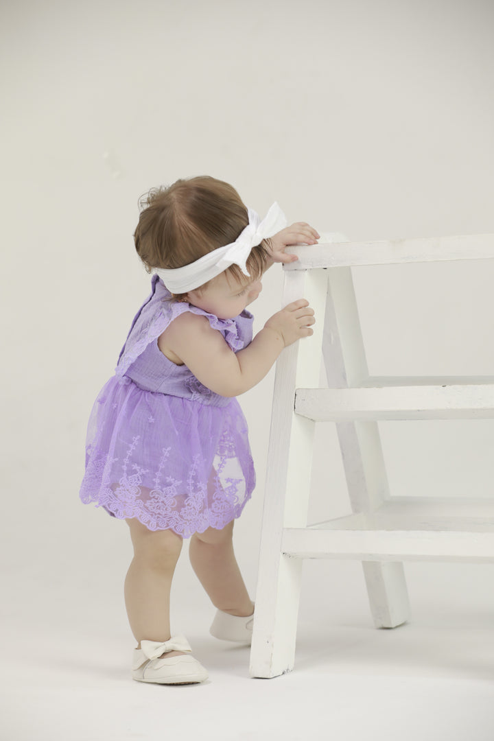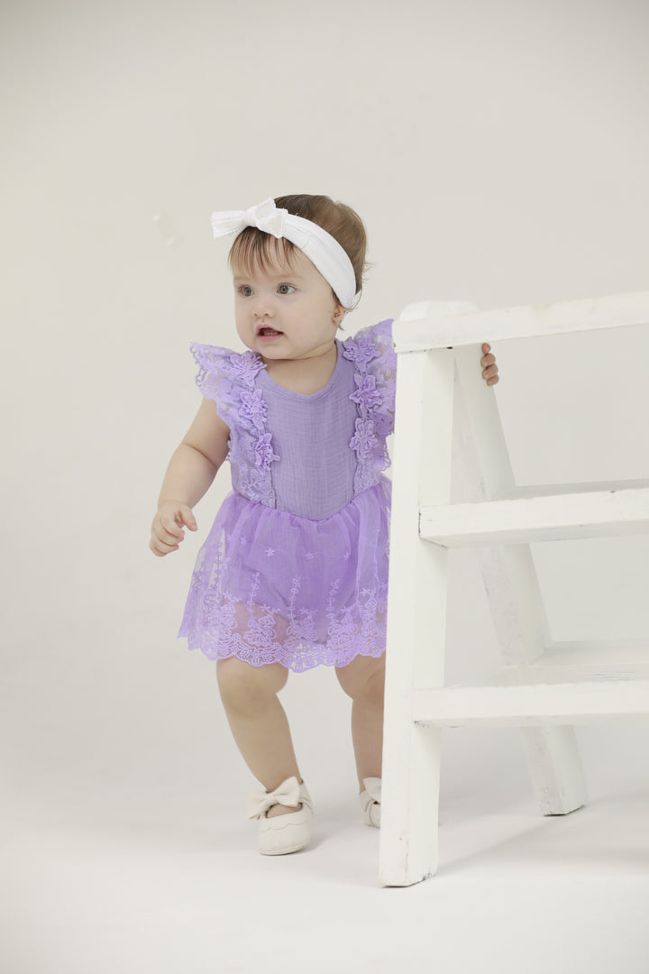 Este precioso mameluco está disponible en dos tonos suaves: lila y blanco, perfectos para resaltar la ternura de tu bebé.