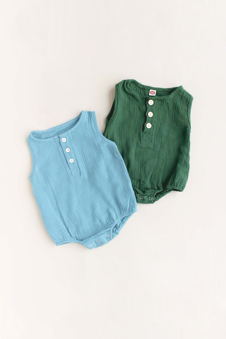 Mameluco sin mangas para bebé elaborado en algodón tipo gasa, un tejido suave, fresco y transpirable que brinda total comodidad en climas cálidos. Su textura natural y liviana lo hace ideal para el uso diario, manteniendo la piel del bebé protegida y libre de irritaciones.