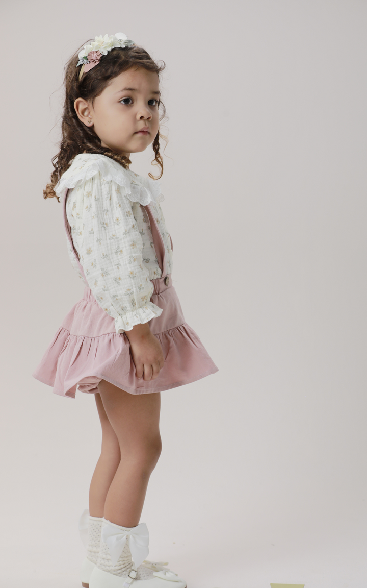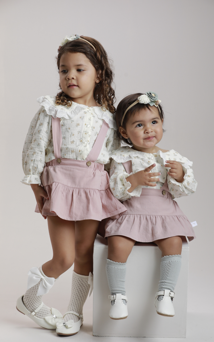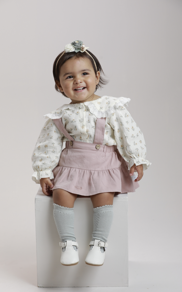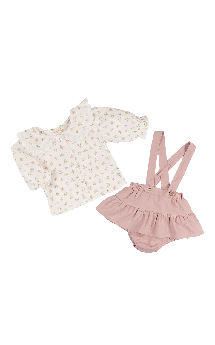 Este encantador set para bebé es una combinación perfecta de dulzura y practicidad. La blusa de manga larga, confeccionada en un algodón suave y ligero, presenta un delicado estampado floral en tonos suaves, botones frontales y un cuello amplio con volantes de encaje, que le da un aire clásico y refinado.