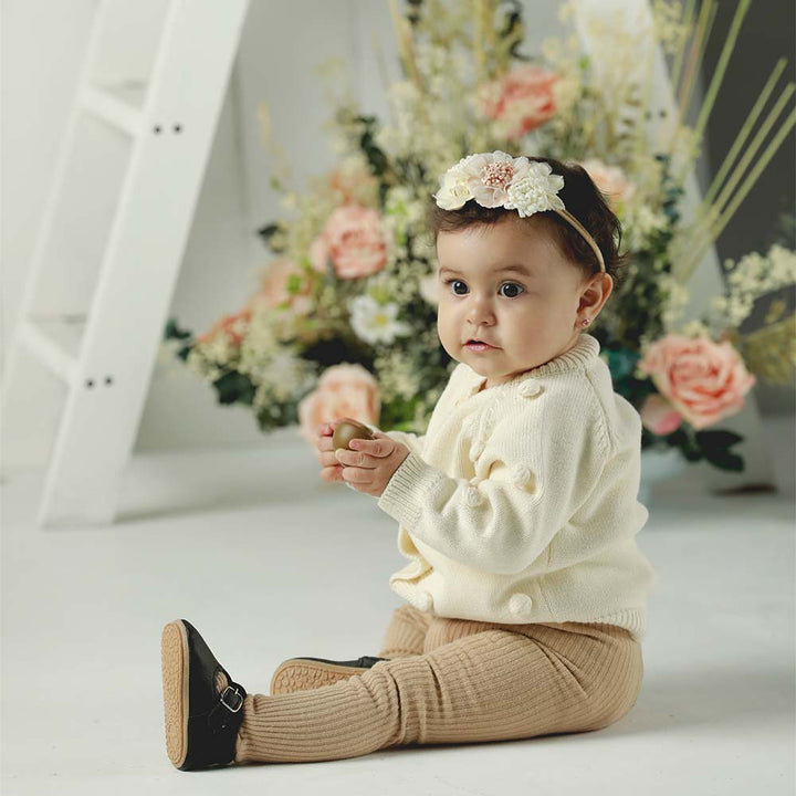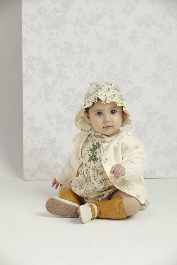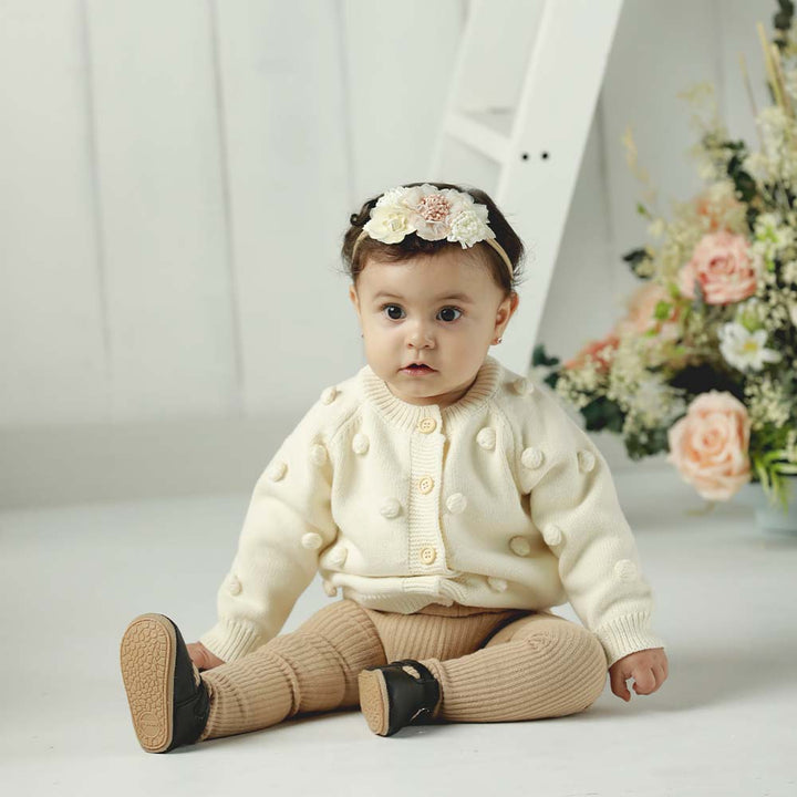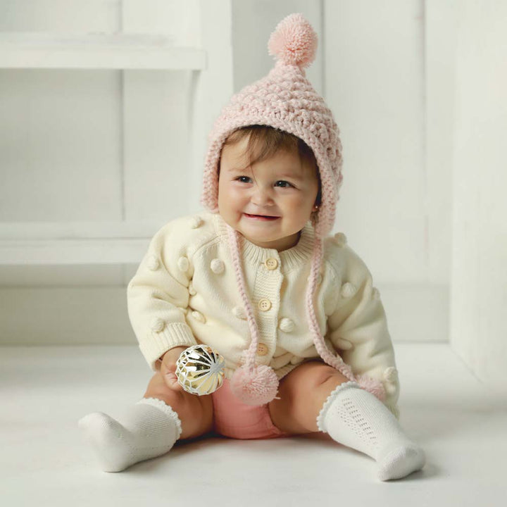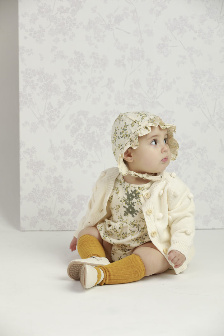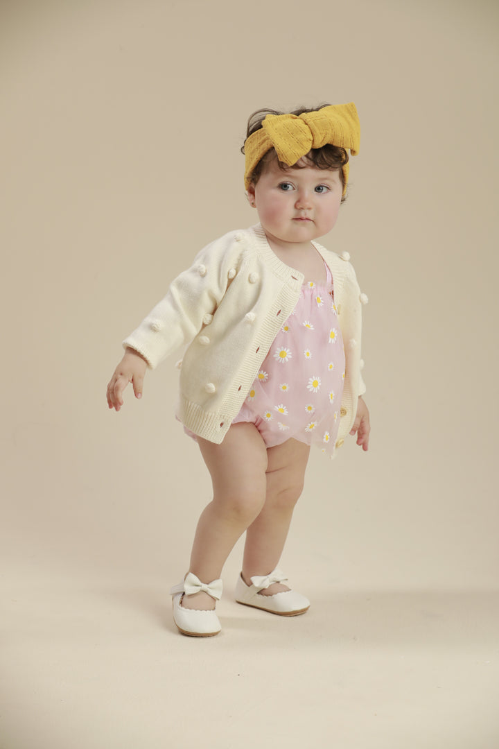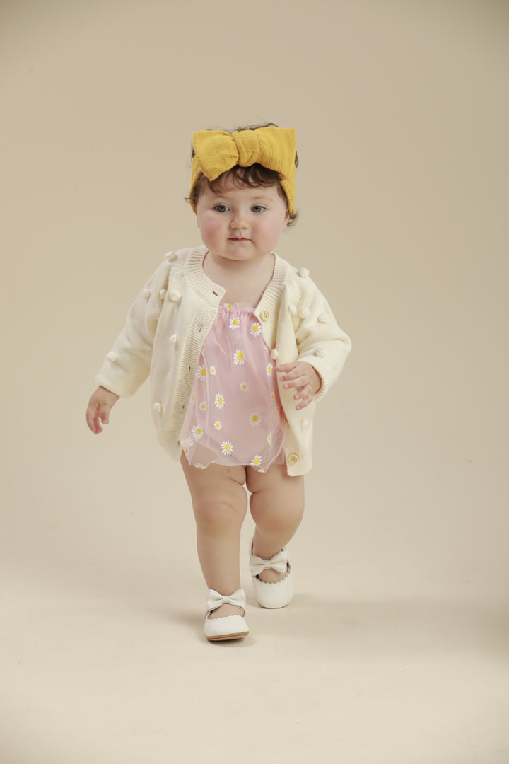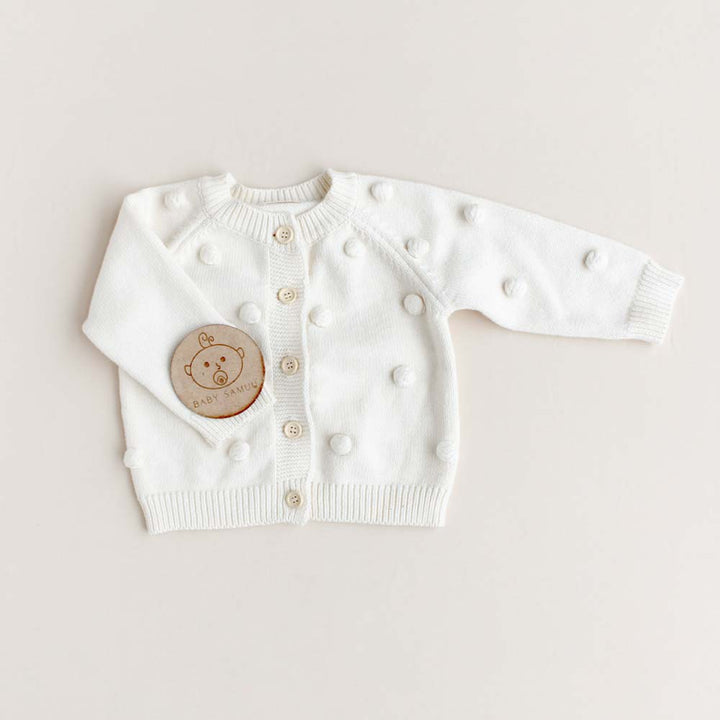 Suéter infantil de textura suave y delicada, confeccionado en 100% algodón para brindar comodidad, transpirabilidad y cuidado para la piel del bebé. Su diseño en tejido plano incluye pompones tejidos al tono, que le aportan volumen, encanto y un estilo único. Cuenta con cuello redondo acanalado, manga larga tipo ranglán y cierre frontal con botones al tono, lo que facilita vestir al bebé con comodidad.