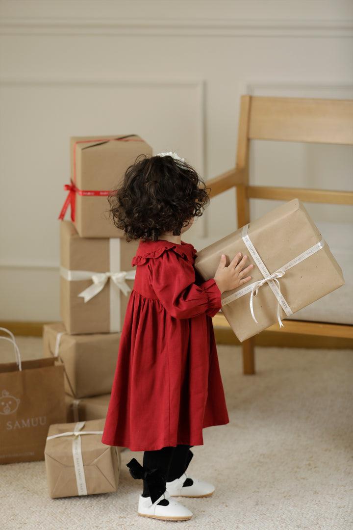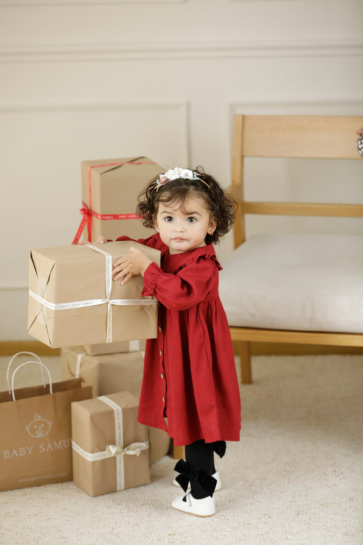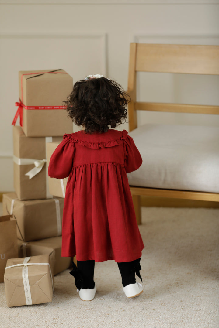Vestido para bebé en color rojo vino, con mangas largas y un diseño de botones en la parte delantera. El vestido cuenta con un cuello Peter Pan amplio que añade un toque clásico y elegante. La falda es suelta y fluida, lo que proporciona comodidad y libertad de movimiento para el bebé. Este vestido es ideal para ocasiones especiales como celebraciones, fiestas o eventos formales.